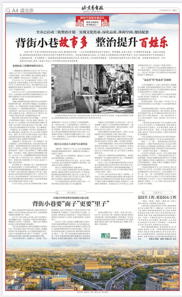 2020年,在第二轮背街小巷整治提升过程中,市规自委探索聘请责任规划师,从专业角度出发,按照北京城市总规的要求对街巷整治方案进行把关,使得街巷整治更符合百姓实际需求。同时,社区议事协商也被引入街巷治理,提前吸纳百姓的意见、建议,“一街一策”为居民量身定制街巷治理方案。“这样,就使得街巷治理方案落地后,老百姓更能接受,街巷治理效果更好,背街小巷治理更得民心。”