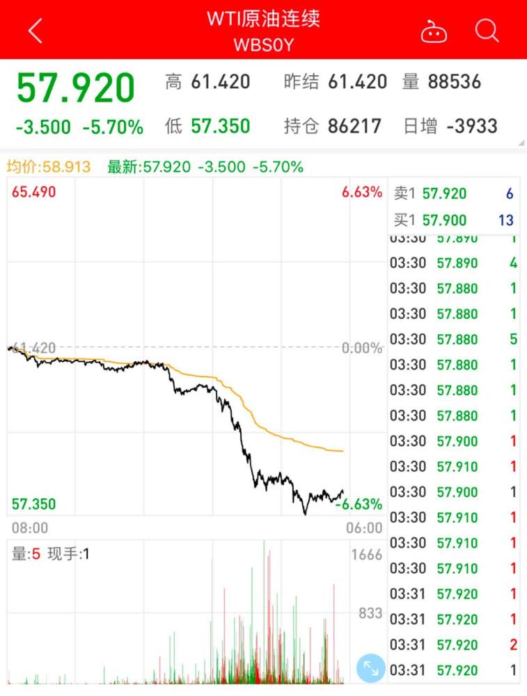值得注意的是,在该消息发酵当晚,国际原油期货持续下挫,WTI原油期货跌幅扩大至5%,布油跌幅超4%;上期能源原油期货夜盘下跌5.6%。